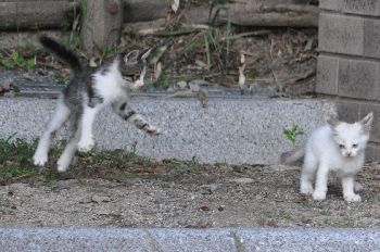 子猫がじゃれながら狩りの練習をしていました。野鳥の敵ですが、自然界の法則なので...。でも、子猫は可愛い。