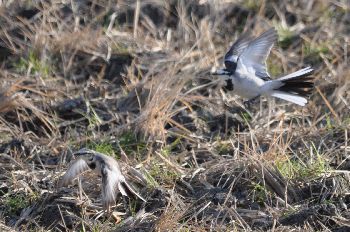 田んぼの跡地では、ハクセキレイがじゃれ合っていました。恋が実ると良いのですが...