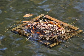 浮き巣に卵はありますが、親鳥がいません。抱卵は、雌雄ともに行い、食事などで出かけるときは、草を掛けて隠すようですが、この寒空に卵がむき出しです。親鳥が抱卵を止めてしまったのかもしれません。