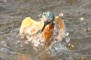 今日もこの寒い中、カワセミは漁を勤しんでいました。魚が川の真ん中付近にいるせいか、止まり木から一度飛びだった後、川の上で一度ホバリング状態で魚を探して一気に飛び込んでいました。何度も川に飛び込みながら1匹を食しました。しかし、まだ食べたりないのかその後も直ぐさま2匹目を目らって飛び込み続け、漸くゲットです。川から飛び立つカワセミは怪獣のようです。