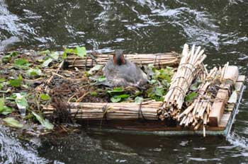 雛の1羽は、早速水中散歩を楽しんでいました。わんぱく盛りです。でも、もう一羽は親鳥にくっ付いて離れない甘えん坊のようです。もう一羽は、気がつけば見当たらなくなっていました。