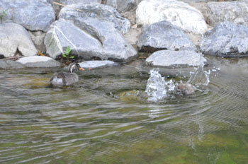 他の2羽の雛は、岸に近い浅瀬で、潜水の練習をしていました。深いとことで、調子に乗って潜りすぎると恐ろしい目に遭うのを知っているのか、浅瀬の付近で嘴を水面に何度もつけて、思い切ってチョコッと潜っているようでした。偉い子たちです。