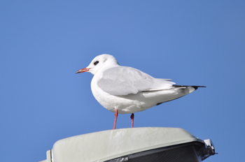 街灯の上に青空をバックにして、ユリカモメがたたずんでいました。気持ちが良さそうです。