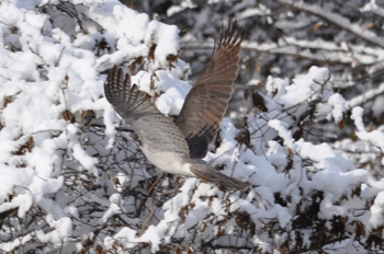ハイタカとカルガモがバトルをしていました。ガァー・ガァーの鳴き声で振り返った時は、ハイタカは狩りを失敗して飛び去っていたところでした。全長30cm弱のハイタカが、倍近くの大きさのカルガモを捕らえるのは、チョッと無理があるのでは?